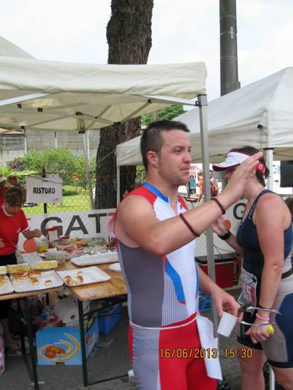 Nel 2011 fu fermato prima della partenza da problemi burocratici relativi al tesseramento non arrivato in tempo, nel 2012 gli spareggi per far salire di categoria la squadra di calcio in cui milita non gli hanno consentito di poter partecipare alla gara ma quest’anno niente e nessuno gli hanno impedito di esserci ed il bello è che l’ha fatto con la nostra divisa. Ha nuotato con forza, pedalato con orgoglio e si è ben gestito nella corsa dove ha sempre seguito il suo passo fino alla finish-line dove era atteso da un gruppo di amici e tifosi locali. Il Roberto va menzionato non solo per i suoi meriti sportivi ma per la grandissima ospitalità dimostrata ogni volta che abbiamo varcato la soglia del suo regno: lo Skipper bar. Ha promesso di venire a trovarci qui a Savigliano, noi lo aspettiamo per portarlo a cena e festeggiare con lui quest’amicizia tra due angoli così distanti della stessa regione.